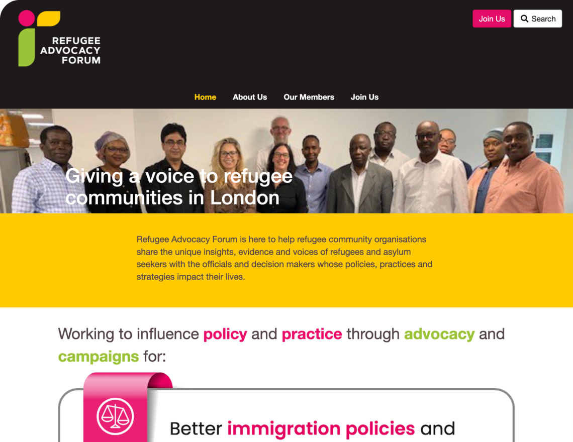 For the Refugee Advocacy Forum we took the Fresh theme as a base, and created a Custom CSS for their bold colour scheme.