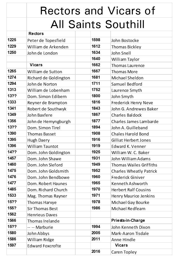 We can conclude therefore, that during the period 1250-1540 the Vicars whose names are recorded were Members of the Order at Newnham, and possibly lived mostly at the Priory House, travelling out to Southill to perform their religious duties. Monasteries were dissolved by King Henry VIII, and from that time until 1667 the Patronage of the living was held by various individuals, including the Queen from 1562 to 1598. From 1667 the Patronage has been the right of the owner of Southill Estate, beginning with Sir John Keeling (or Kelynge), then the Torrington family 1711-1795, and the Whitbread family from 1795 to 1994 when the Bishop of Bedford suspended the patronage and appointed the new Priest-in-Charge. In 2013 the patronage was reinstated when the Priest-in-Charge was appointed Vicar.