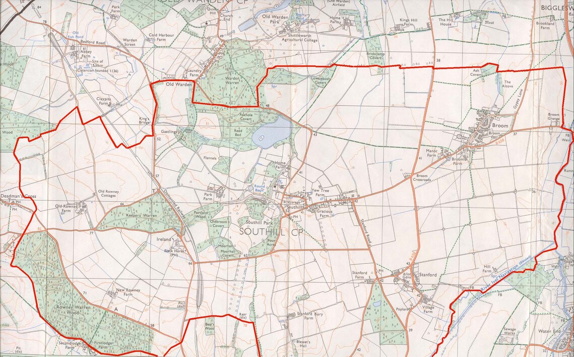 - Southill Parish is geographically the largest in the Deanery, but sparsely populated. Much of the land is committed to farming, whilst Southill Park is extensively wooded. The Parish comprises three villages - Broom, the largest, Southill and Stanford - and the hamlet of Ireland which together cover an area of 2291 hectares. The population totals some 1250, of which about a fifth are retired people. The occupational mix is broad and although home ownership now predominates, a significant number of the approximately 520 houses are rented. All the Parish lies within both Southill Parish Council and Central Bedfordshire District Council.
