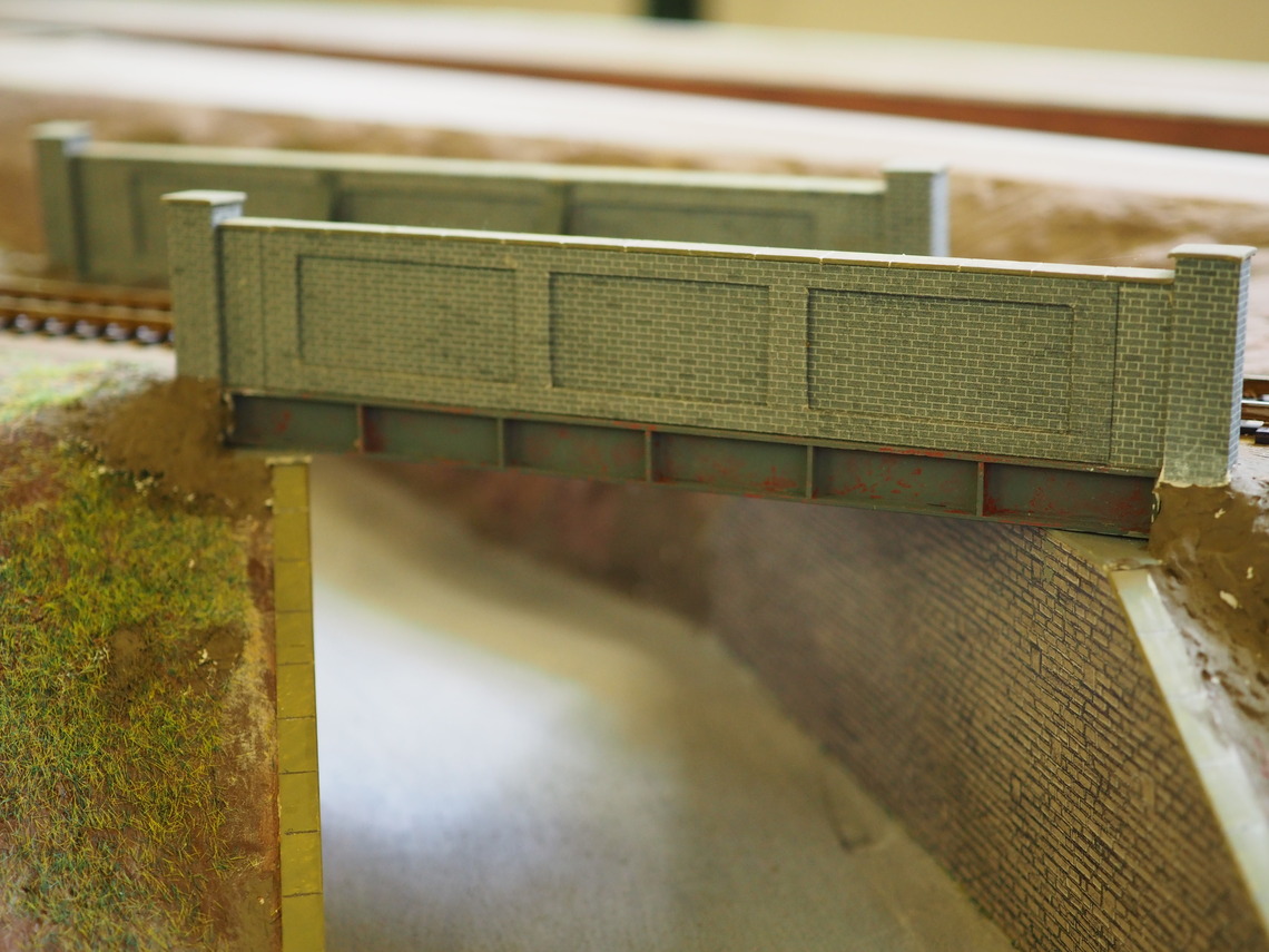 Geoff and Malcolm made up the new baseboards on generally the same principles as the storage sidings; they are wider than the originals and hinged on their long side for maintenance access. The baseboard at one end of the station has had a dropped section built in to it to create some contours to the otherwise flat boards. A road winds its way down and under the approach loop into the goods yard area and up to the back of the station building.