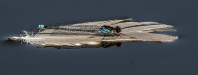 Red Eyed Damselfly on a feather boat