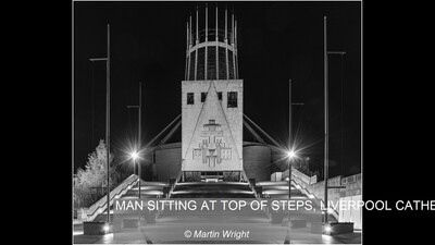 MAN SITTING AT TOP OF STEPS, LIVERPOOL CATHEDRAL