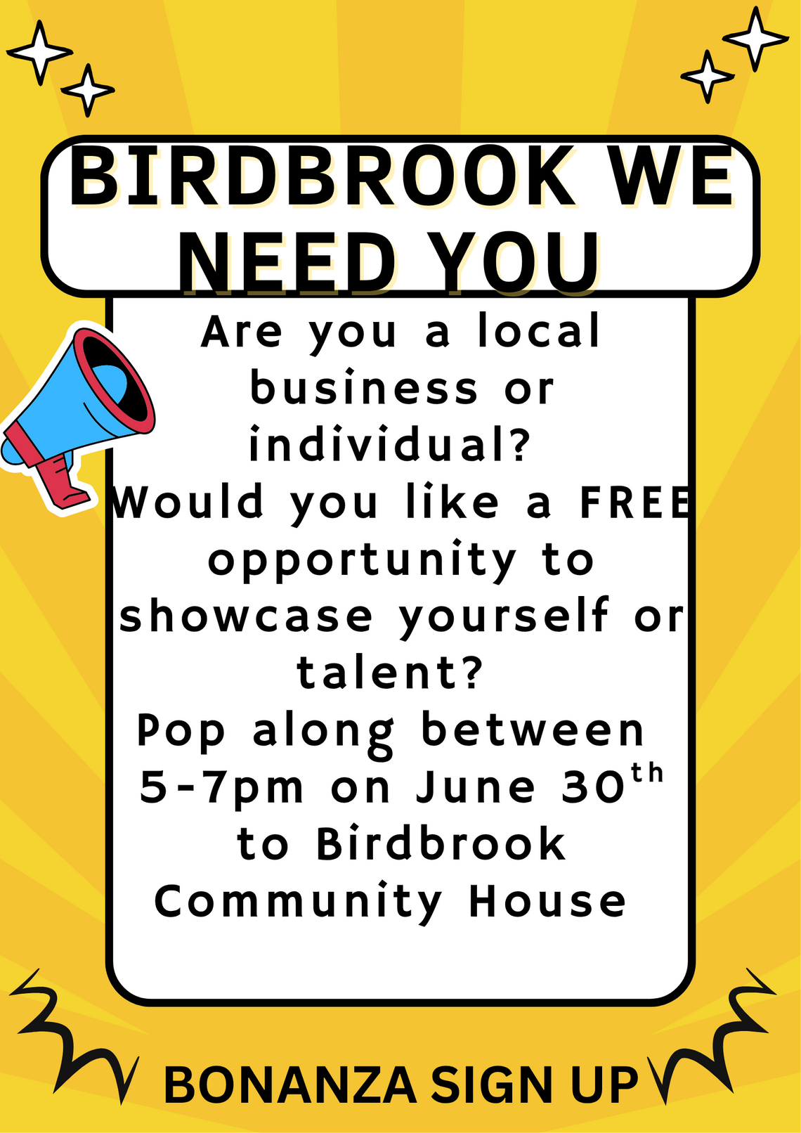 Pop in to the main hall between 5-7pm to sign up your business or as an individual to have a stand/display or run something during the Birdbrook Bonanza on August 16th 2025 !