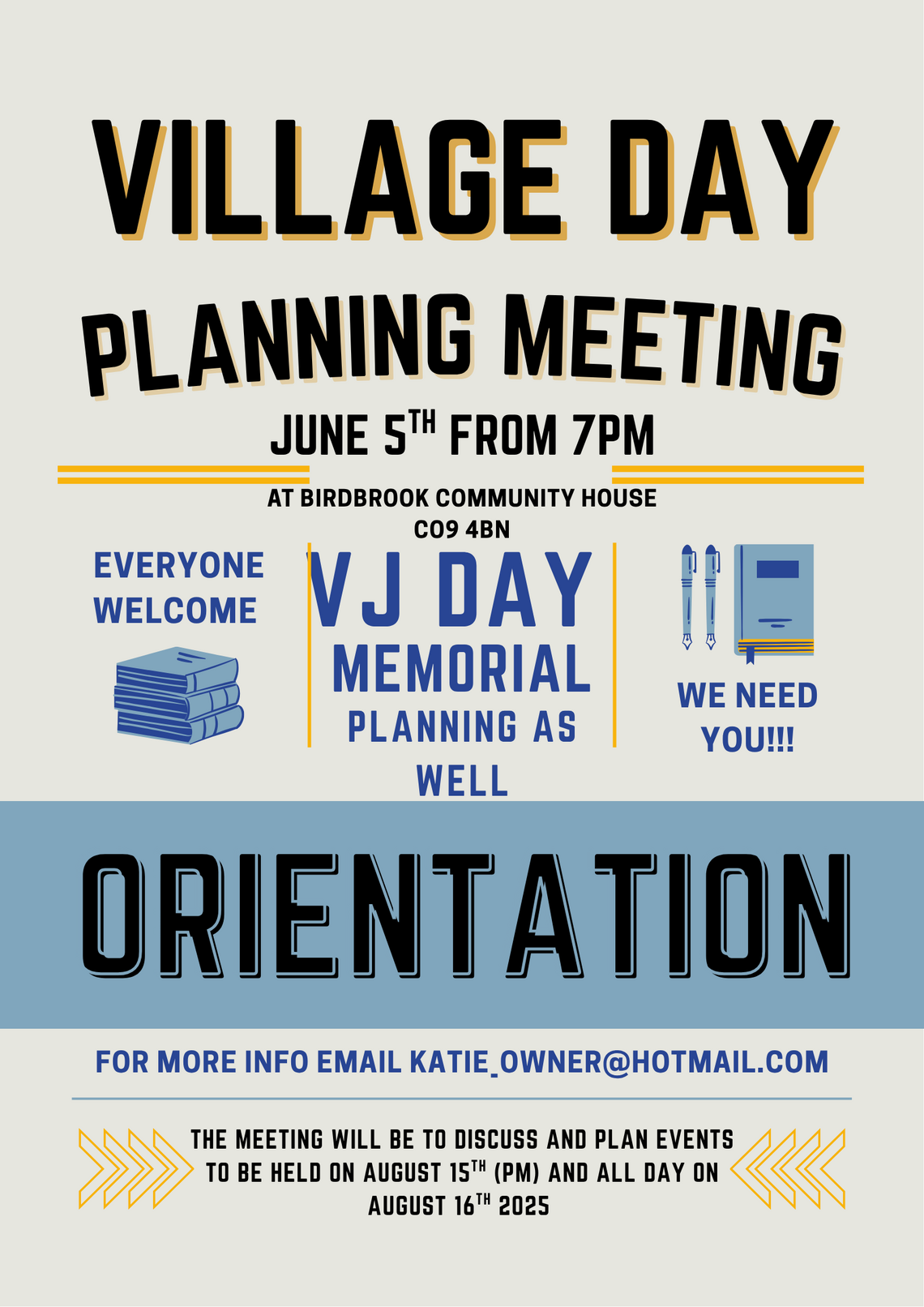 We'd love to see as many of you as possible at Birdbrook community house from 7pm on June 5th to discuss ideas and begin organising a VJ Day memorial and VILLAGE DAY. The plan is for the events to take place on August 15th (pm) and the full day of Saturday 16th August 2025