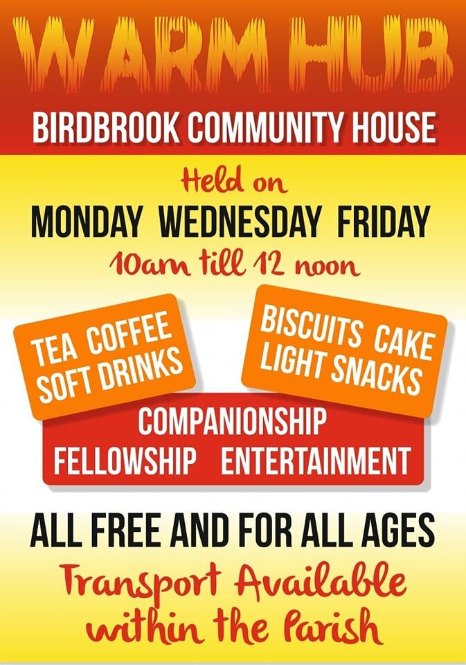 Birdbrook Community House has recently added to its list of uses by becoming the Community Warm Hub on Mondays, Wednesdays and Fridays each week.Everyone is welcome to pop into the warm hub for a hot drink, biscuits, light entertainment and on some days even homemade cakes from our marvellous volunteers.