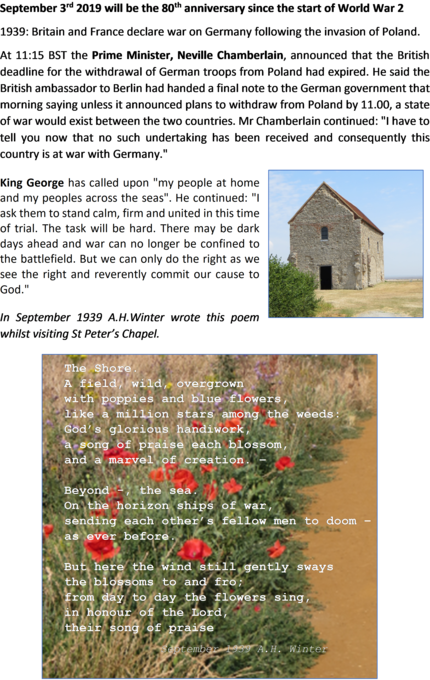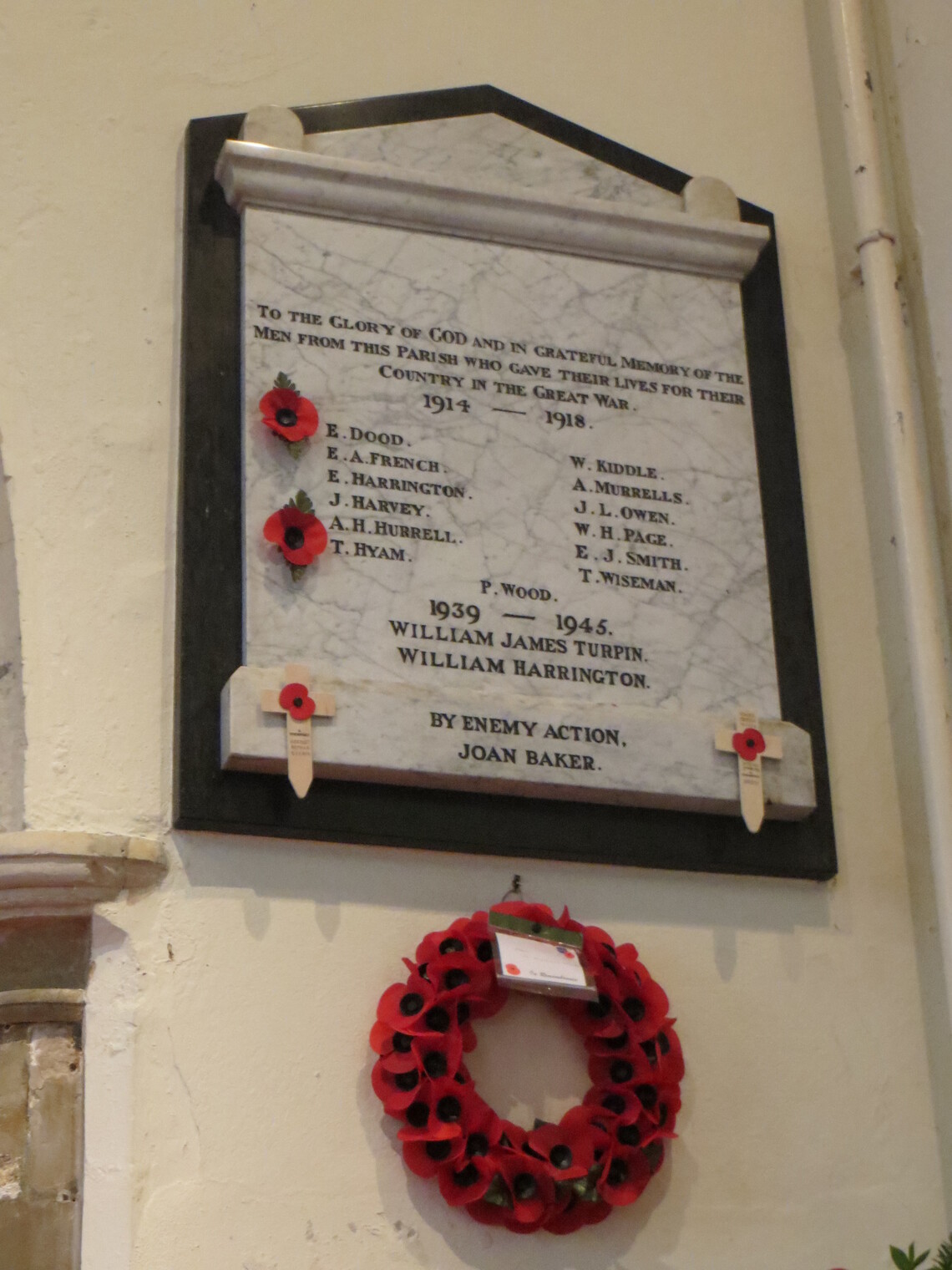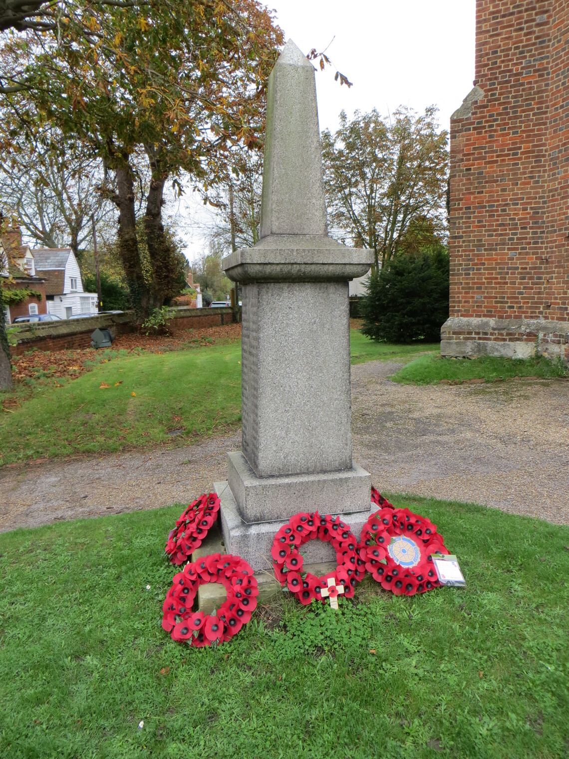 On Remembrance Sunday the parish remembered those who gave their lives in the two world wars so that we may be free today. With over 100 people in church the congregation listened with the nation to the memorial service at the Cenotaph, after the two minute silence the Vice Dean of Chelmsford Cathedral Revd. Canon Ivor Moody took the service. Poppy wreathes were laid at the war memorial by representatives from the Parish Council, Church, Uniformed groups, Rotary Club and members of the parish both from the past and the present. At the end of the service the congregation processed out of the west door and laid some of the wreaths on the WW1 Roll of Honour memorial in the churchyard concluding with the singing of the National Anthem.