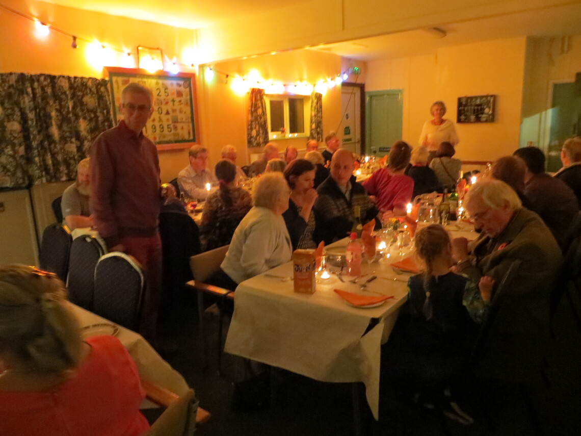 Forty three people filled the Committee Room of the Village Hall to enjoy the result of the labours of members of the PCC and congregation of St.Thomas’ Church. And enjoy it they did. After a thoughtful and prayerful message from Revd.Brigid Main, the first course of carrot and coriander soup was served with hunks of different types of bread, after which the guests proceeded on to jacket potatoes, ham and plenty of fresh salad to which they helped themselves from bowls on the tables. None meat eaters were catered for as well with a home made vegetarian quiche. There was a choice of dazzling home made deserts over which pudding buffs could really indulge as so much was provided.