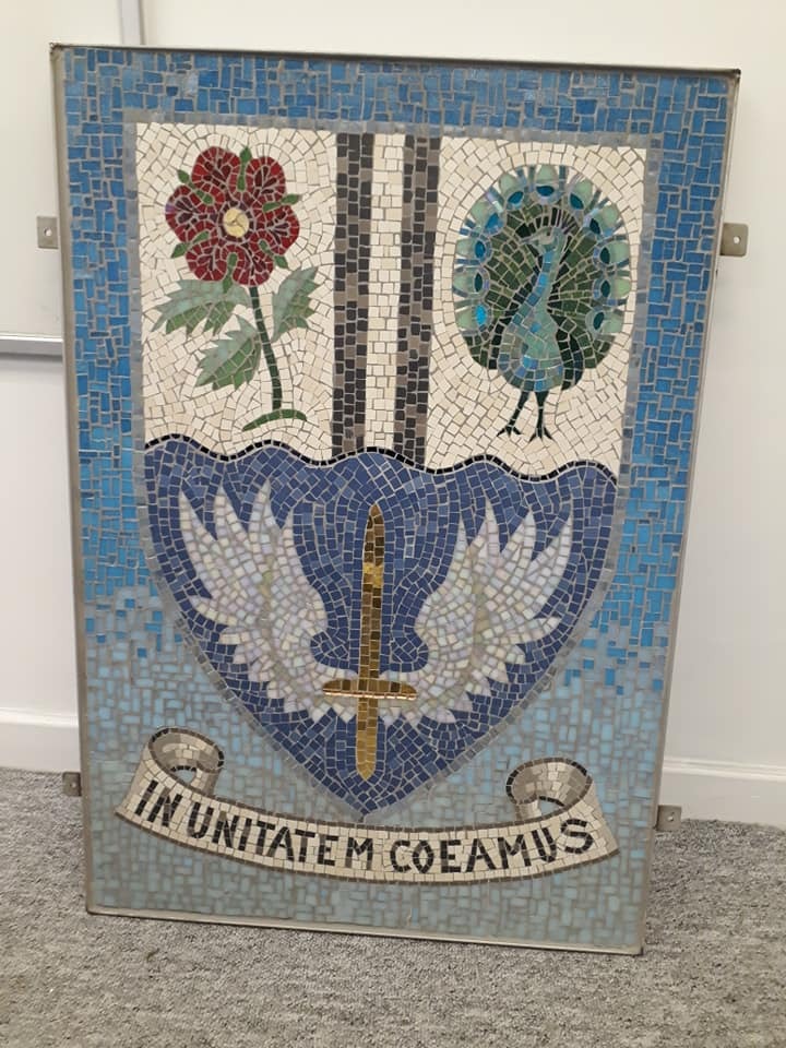 In addition, the Feltham Urban District Council shield is included as well. The Rose represents Hanworth, The peacock is Bedfont, and the sword represents Feltham's MOD and the wings represent the aircraft heritage.