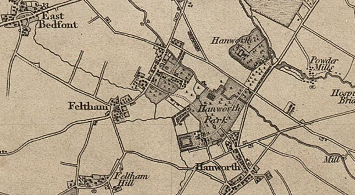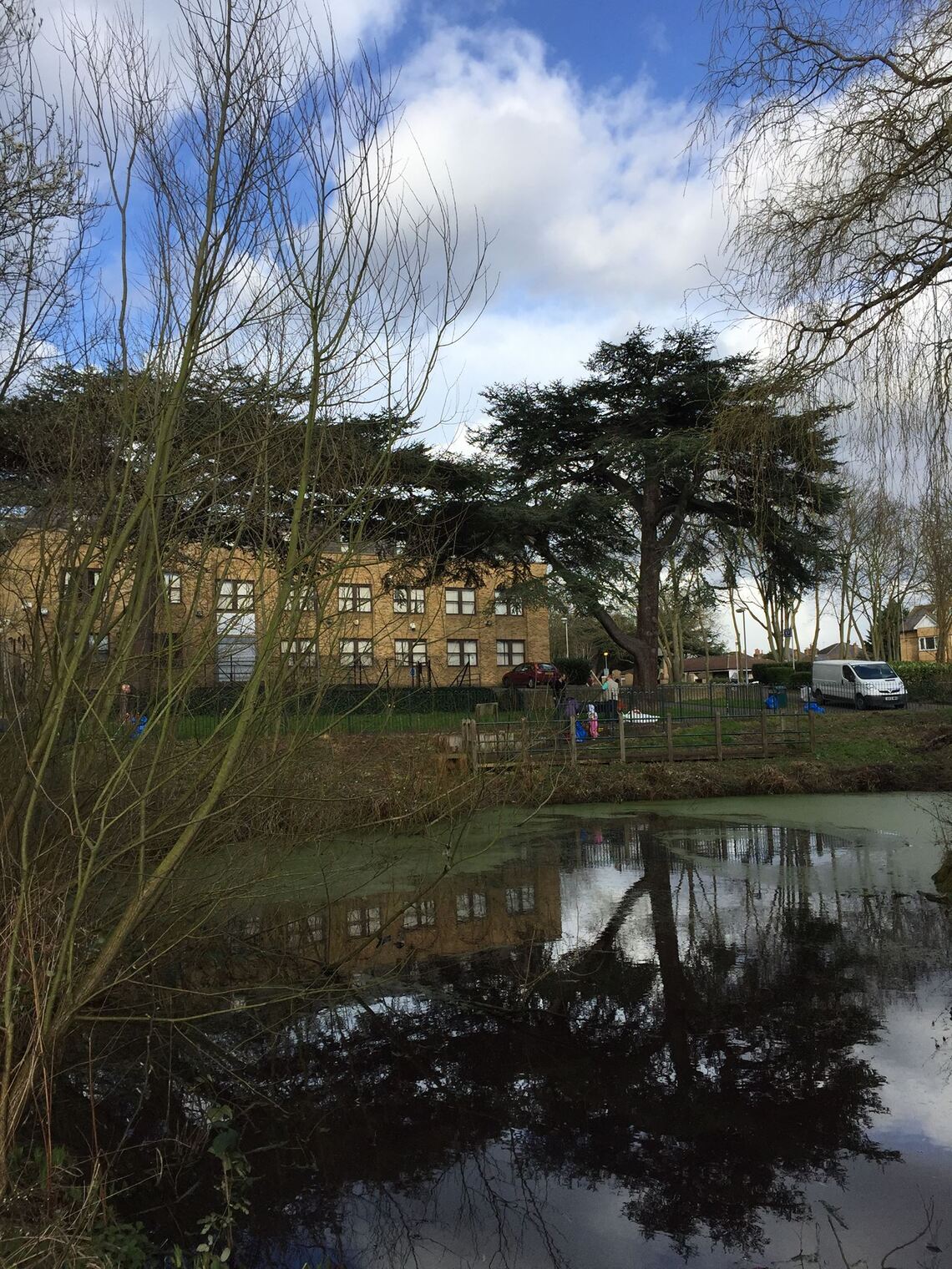 The pond is actually a Victorian 'borrow pit' - soil was extracted around 1848 when the new railway line to Windsor came through the area (before this time, the village of Feltham was much smaller and centred around St Dunstan's Church - with some larger houses on what we now know as the High Street, linked to Hanworth Park). Hanworth Road was re-directed when the bridge was built (it previously ran past Bridge House and formed a T-junction with the Hounslow Road).