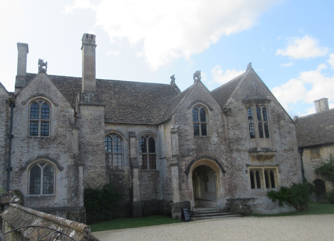 Great Chalfield Manor was built between 1465 and 1480 by Thomas Tropnell, a lawyer and land owner. Our guide hinted that his fortune was amassed not altogether legally. He managed the financial affairs of other people; records were not always kept resulting in Tropnell becoming a wealthy man. He laid claim to the land on which Great Chalfield was built after a legal dispute involving the Bishop of Salisbury. The Manor has a defensible gatehouse (it was built during the Wars of the Roses) and did have a perimeter wall. It has a great hall which is looked down on by three stone masks with eye holes through which people in the upstairs rooms could spy on the people below. One of the masks is thought to represent Henry VI as it has an asses ears, another is thought to represent the Bishop of Salisbury and is equally unflattering.