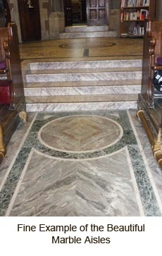 The Nave and AislesThe flooring here came in the main from Devon. The central passage of the Nave and North and South Aisles are laid with grey Petitor marble from Devon with bands of green Tinos and Skyros from Greece. The Dado which is the marble skirting which runs along the lower part of the North and South Aisles has a Cippoline marble plinth (from Euboea) with a background above of Greek Skyros, inlaid with other marbles to form the “four— leafed clover” and diamond shaped panels, etc. |