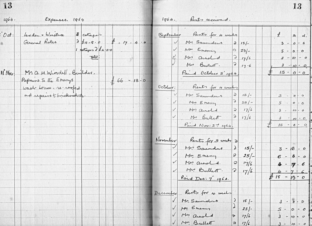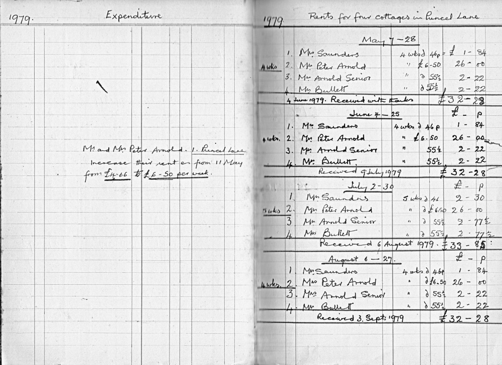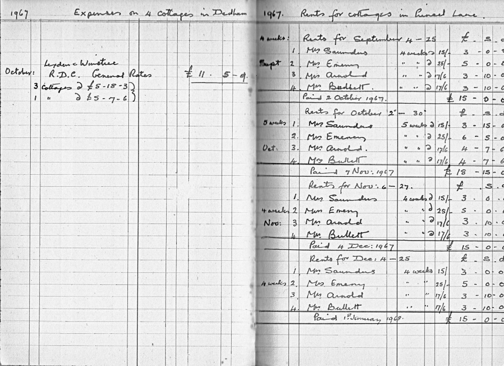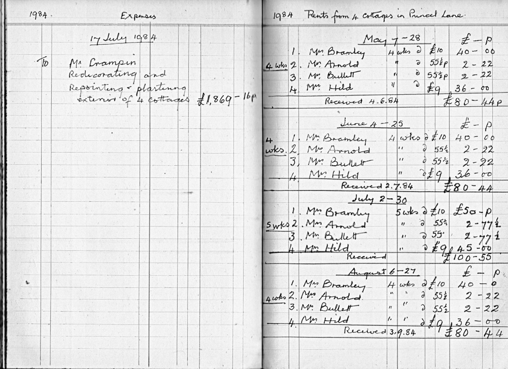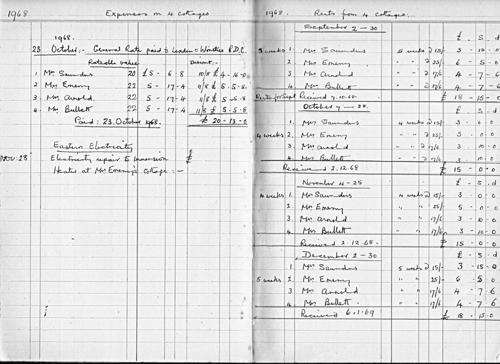 This is an interesting document to observe how rents and costs have changed. The cottages were purchased 11 December 1956. The rent per cottage in 1957 was 27p (5/4d) per week, this had risen to a staggering 55p (11s) by 1987. The four cottages insured for £2,000 1956, new roofs on four cottages 1961 (£593), new roof to wash house 1964 (£66.18s). With effect from 1973 rent was reduced but tenants now pay previously included rates and water rates! All cottages rewired 1979 (total cost £800). Exterior repointing, plastering and decoration 1984 (Total £1869). NB. Mrs Bullett was resident in no.3 in 1957 and still there in 1987 when rent book records finish!