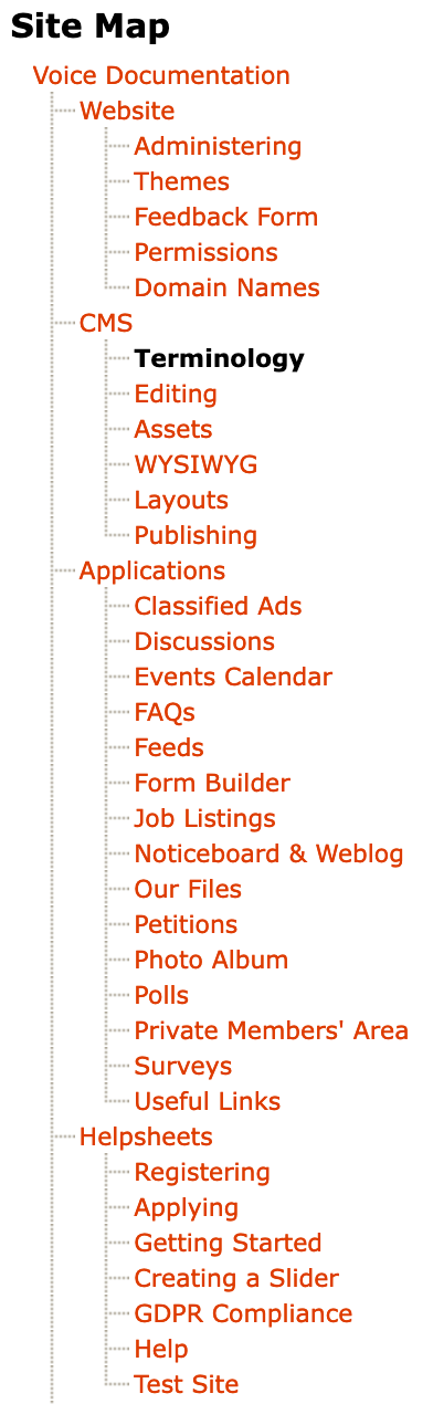 The example to the left shows the site map for this Documentation site, while editing this Terminology page. You will see that the pages are organised into sections of related content.
