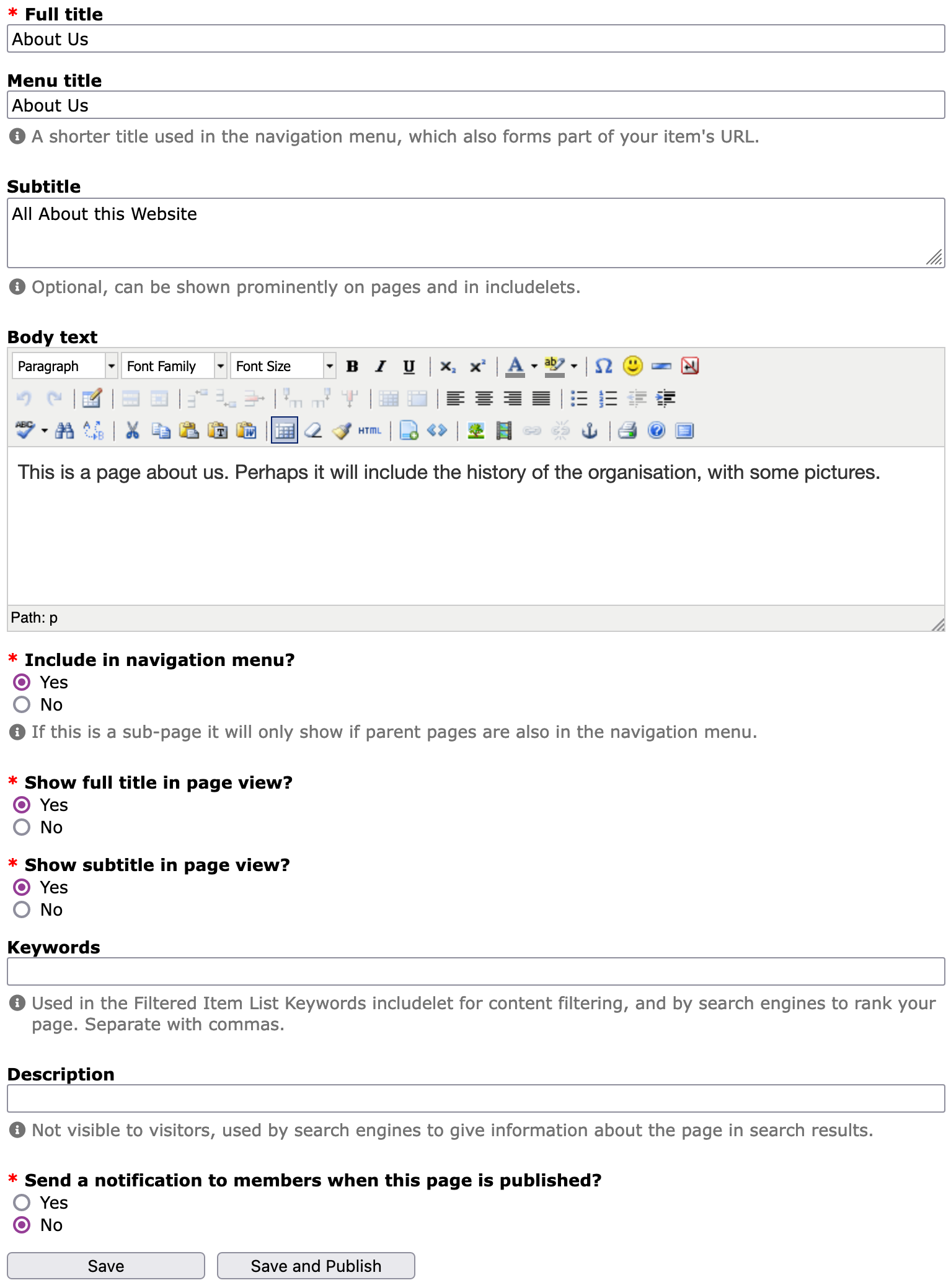 Whether creating a new page or editing an existing one, you will be presented with a form which looks like this: