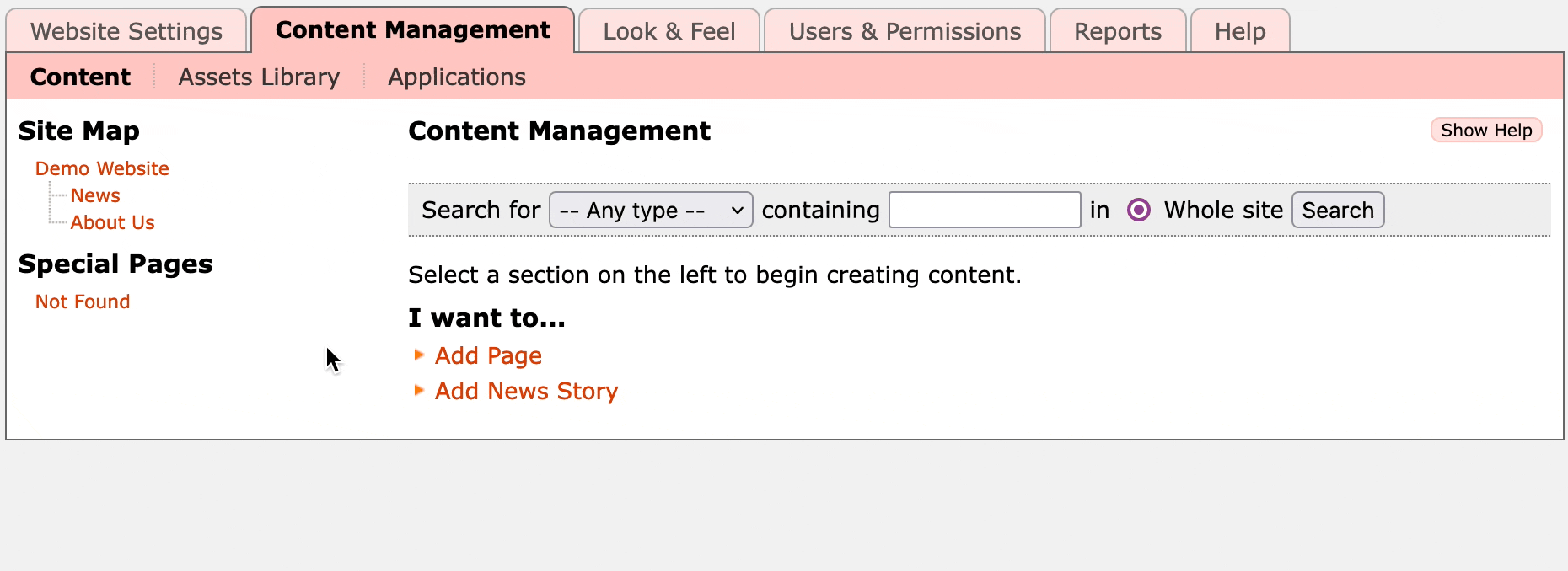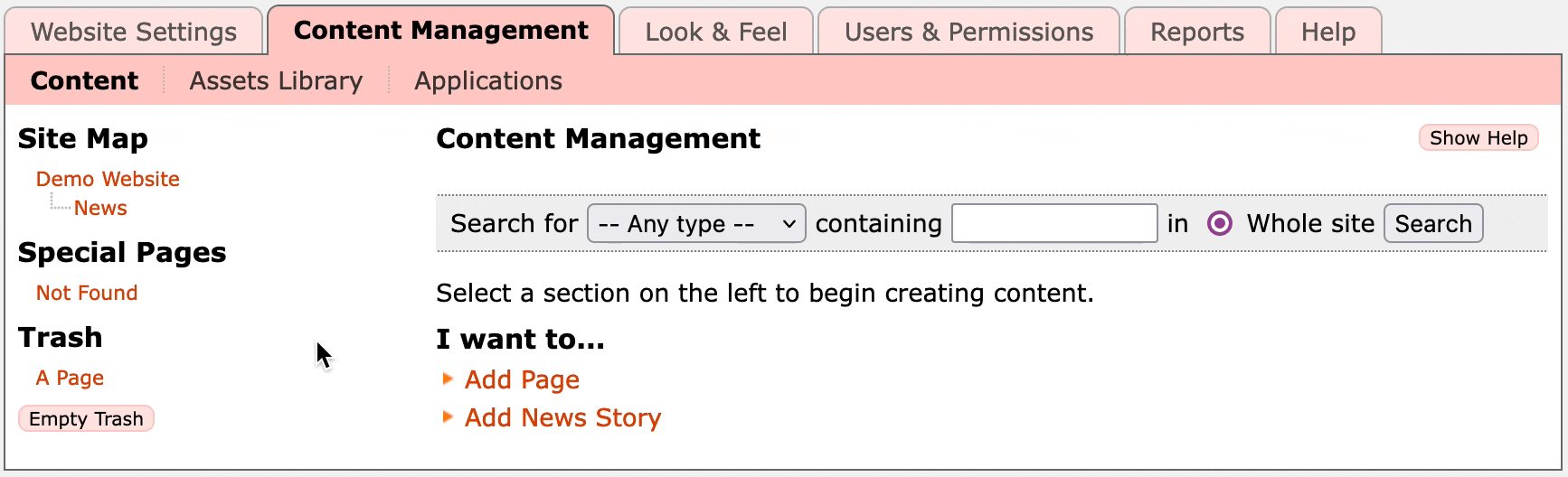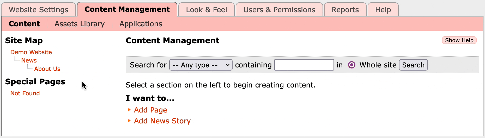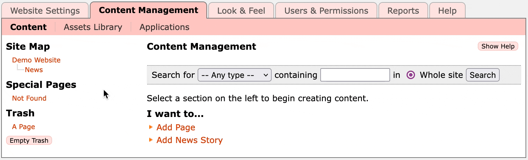On the left you'll see the Site Map, which shows a tree of all the content pages in your site. In this case Demo Website is the main homepage, then we have an About Us and News page at the top level, and a New Website page inside the News section.
