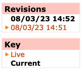 The revision history box indicates which version of the page you are editing. The currently selected page is shown in bold and black, and the currently live version is shown with a small arrow next to it (as shown in the "Key" box). (If the currently selected page is the live version it'll be bold and black and have a red arrow!)