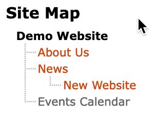 The Site Map is a hierarchical view of the pages within your website. Any item in grey is an application and clicking on it will take you to the administration pages for that application. An item in red is a content page, and clicking on it will take you to the page where you can edit it. The currently selected item is highlighted in bold and black.