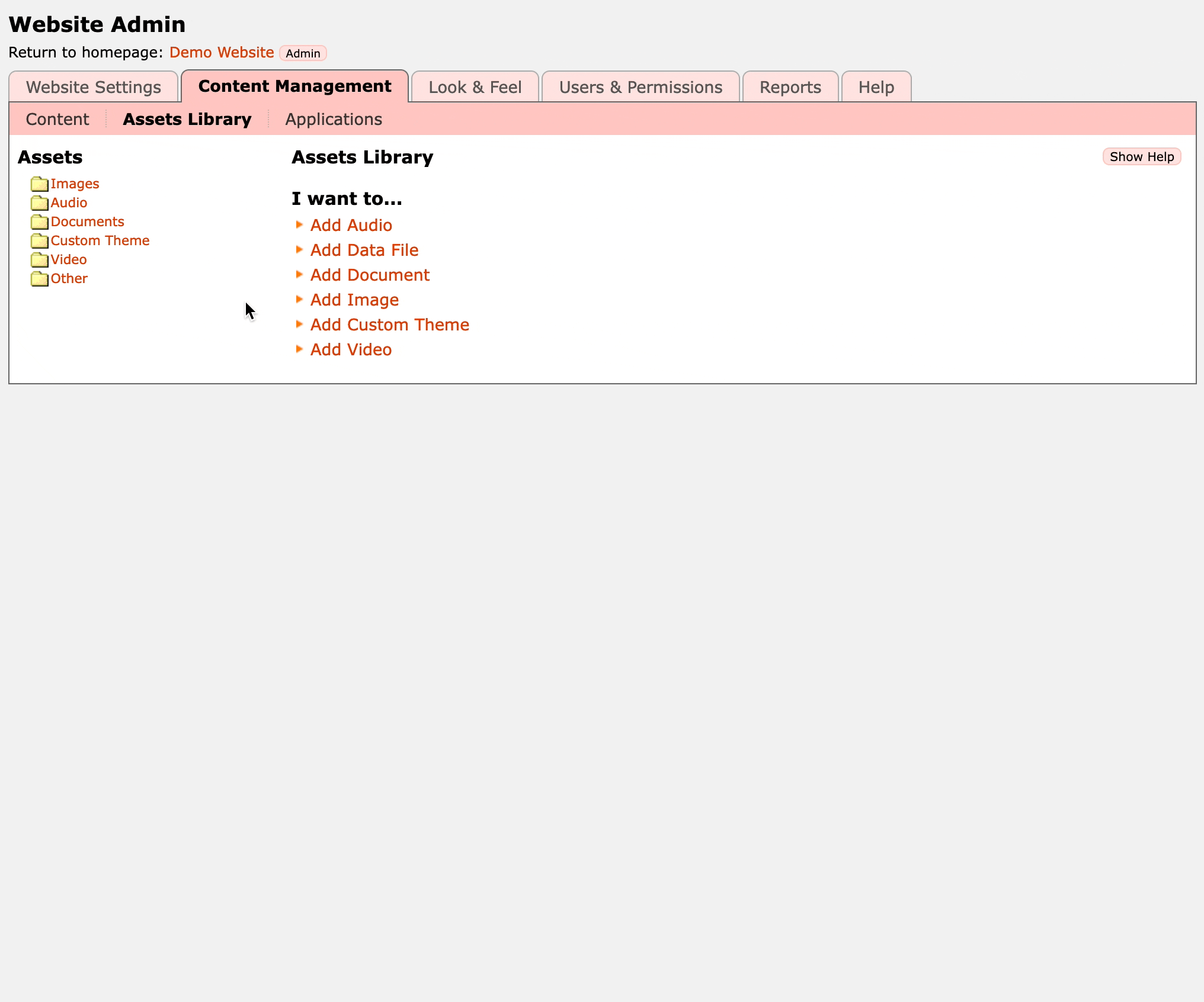 Before we can add an image to a page, we must first add it to the site's Assets Library. This is found in the Content Management tab of the admin pages.