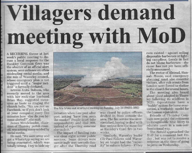 As promised, we will now be inviting the MOD and Surrey Fire & Rescue to attend a second meeting so that your questions can be put to them. Jenny and I will be working with the Parish Councils and anyone else we can to achieve a safer neighbourhood.