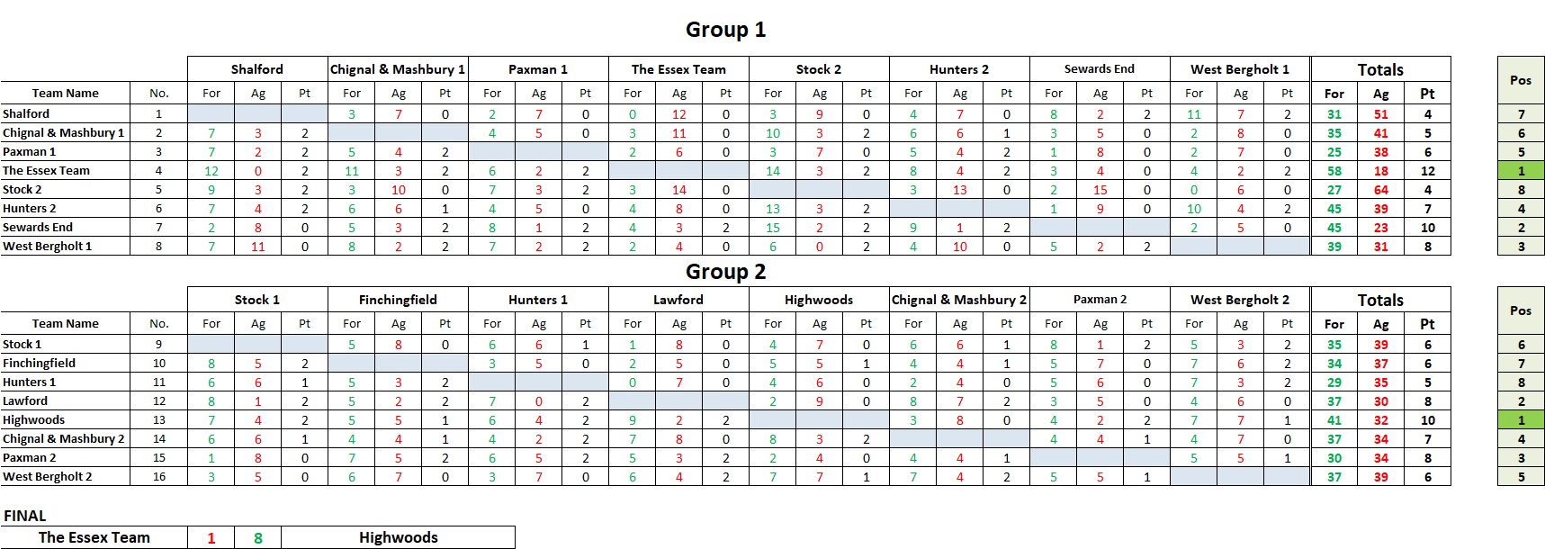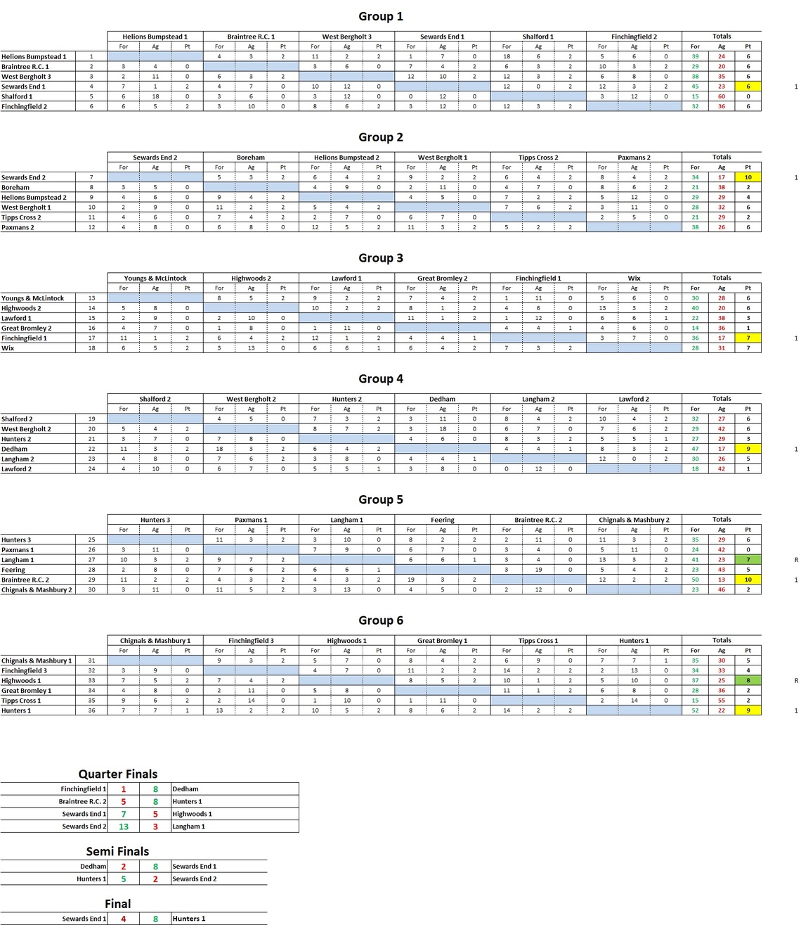 The quarters finals saw Hunters 3 beat Braintree RC 2 + Chignals & Mashbury beat Finchingfield 1 + Highwoods 1 beat the Odds & Elmstead Market 2 beat Paxman 4.