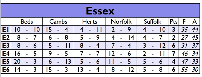 Essex Teams 1 + 3 + 5 all recorded two wins & a draw each (5 points each)
