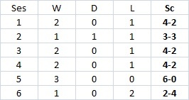 Teams 2 & 6 two wins & one defeat (4 points each) and Team 4 one win (2 points)