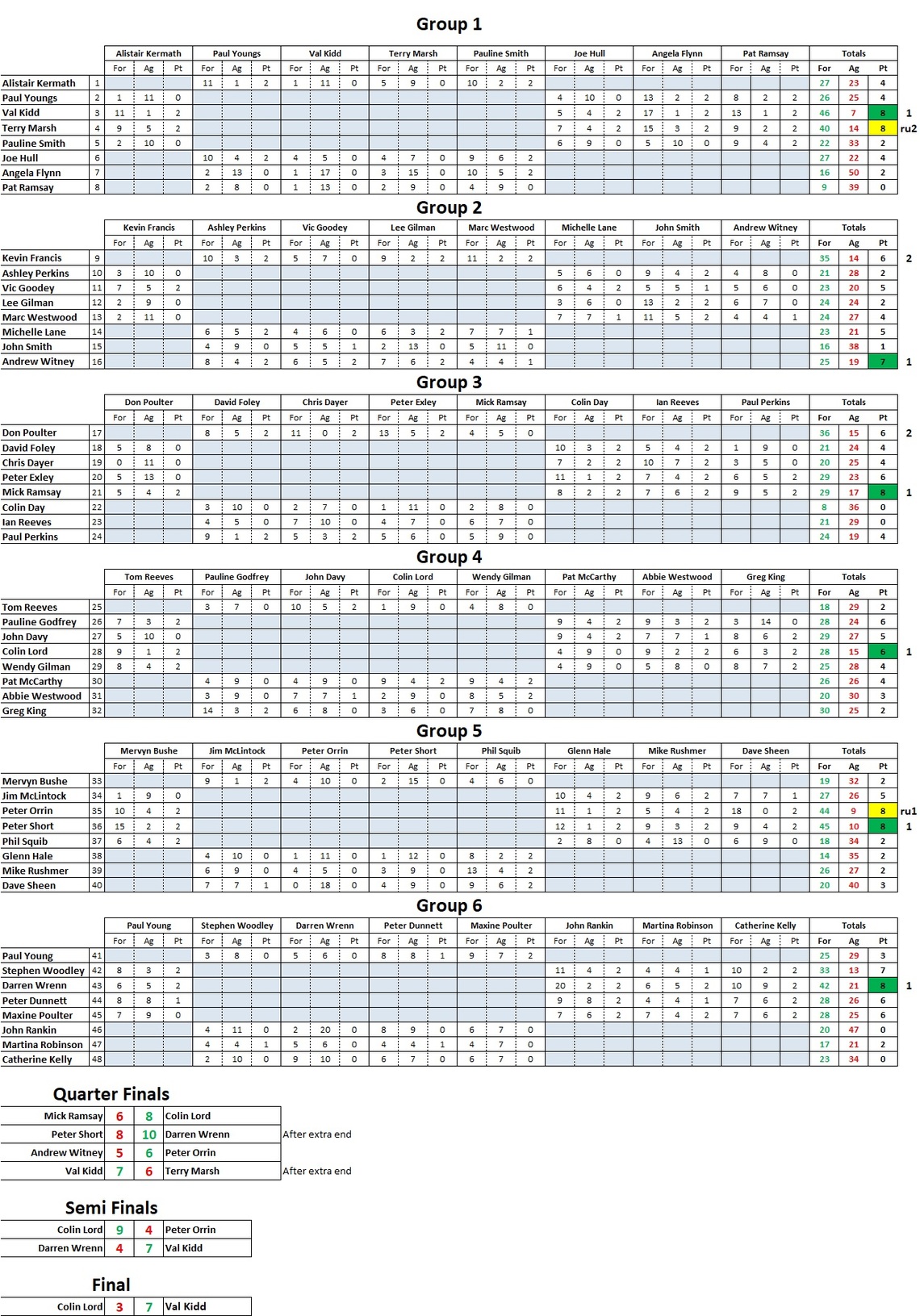 The Rinks of Sarah Richards/Rob Myall/Terry Marsh/Diane Orrin & Jacky Brown/Sandra Strange/Paul Perkins/Colin Lord & Trevor Kidd/Sue Parrish/Paul Young/Don Poulter each had 1 win and two points each for the team