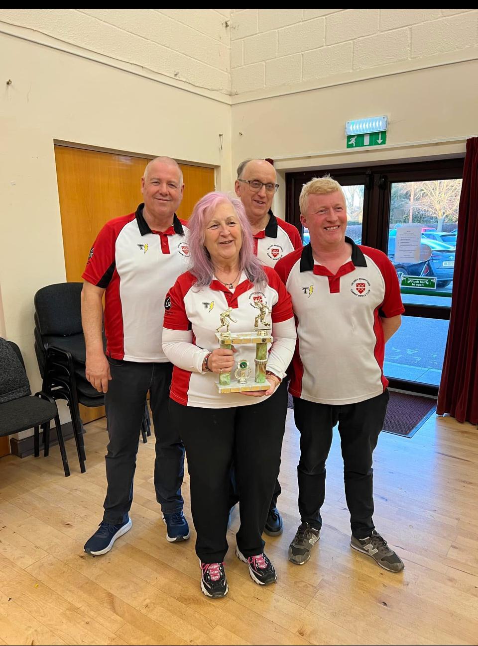 Well done to the whole Team, made up as follows, Singles E1 Don Poulter + E2 Greg King + E3 Colin Lord + E4 Mervyn Bushe, Pairs E1 Val Kidd & Maxine Poulter + E2 Marilyn Bennet & Peter Orrin + E3 Sue Parrish & Rob Myall + E4 Darren Wrenn & Ginge Searle. Triples E1 Jim Mclintock & Ashley & Paul Perkins + E2 Terry Marsh & Wendy Gillman & Diane Orrin + E3 Michelle Lane & Lee Gillman & Martin Bennet + E4 Jacky Brown & Peter Marchant & Helen Tucker.
