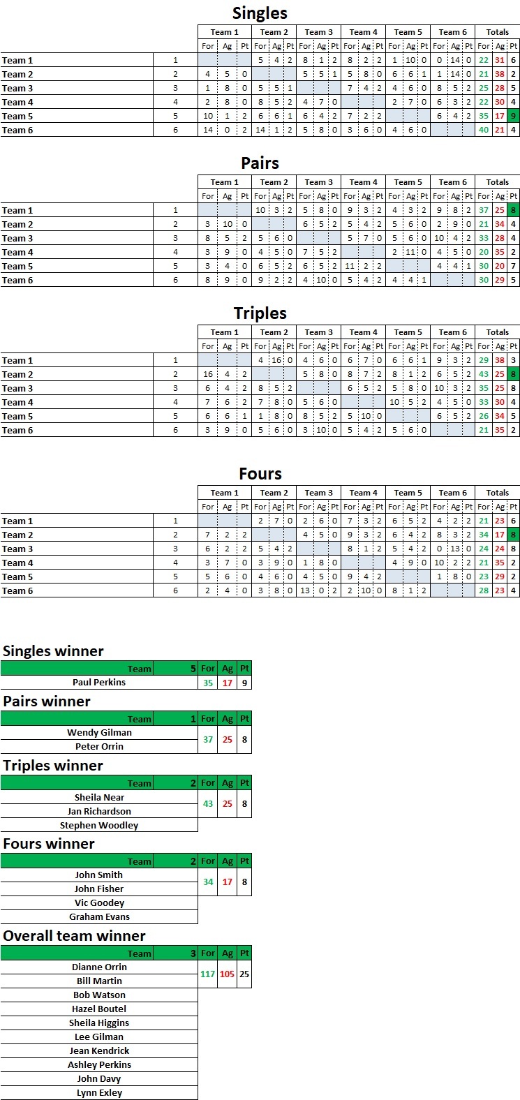 The other two Rinks won 2 of their 5 matches played - Terry Marsh/Sarah Richards/Darren Wrenn/Diane Orrin + Andrew Searle/Sandra Strange/Paul Perkins/Colin Lord
