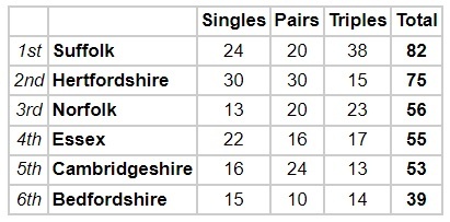 All disciplines and all teams contributed to the Essex total with 56 points achieved. Singles 19 points + Pairs 24 points & Triples 13 points.