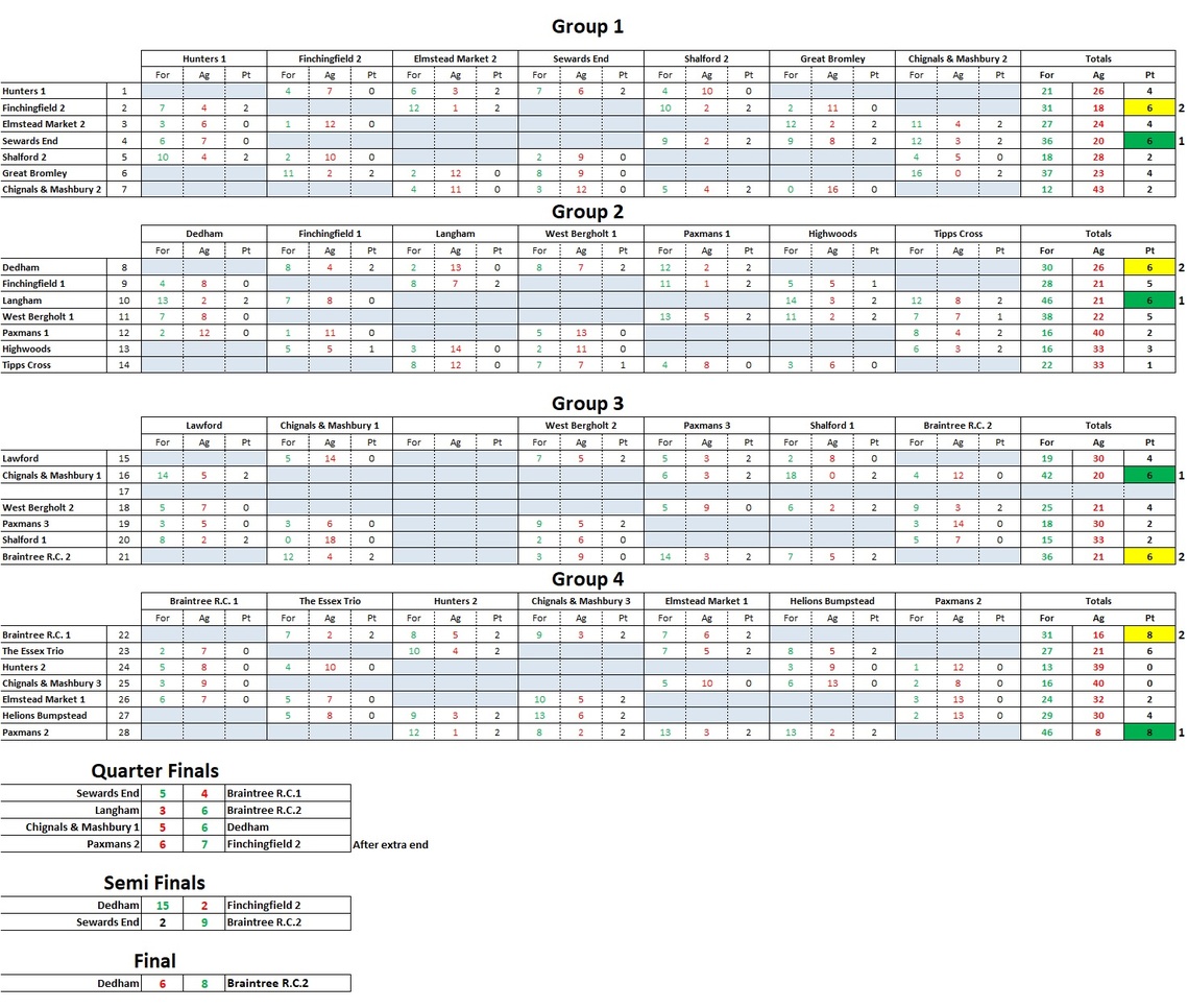The final two matches played during a long day saw Team Essex winning against Bedfordshire by 16 - 8 and finally against Norfolk 14 - 10 to secure 4th place.