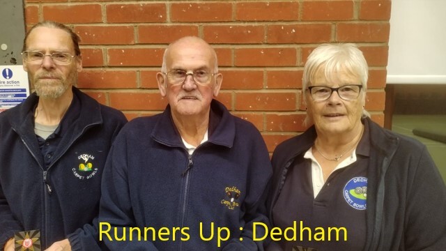 After a long day the final was played between the Dedham Team of Lin & Ron Hill and Trevor Holbrow against the Rayne Team of Maxine & Don Poulter and Trevor Kidd. A good quality final saw the Dedham team winning. Many congratulations to all who took part and all those who helped during the day but especially to Dedham as winners and they will now represent Essex in the Eastern Counties Champion of Champions at Littleport on Sunday 14th May 2023. Unfortunately they will not be available for the National Champion of Champions at Stanley Durham on Saturday 3rd & Sunday 4th June and the Runners up have been invited to take their place