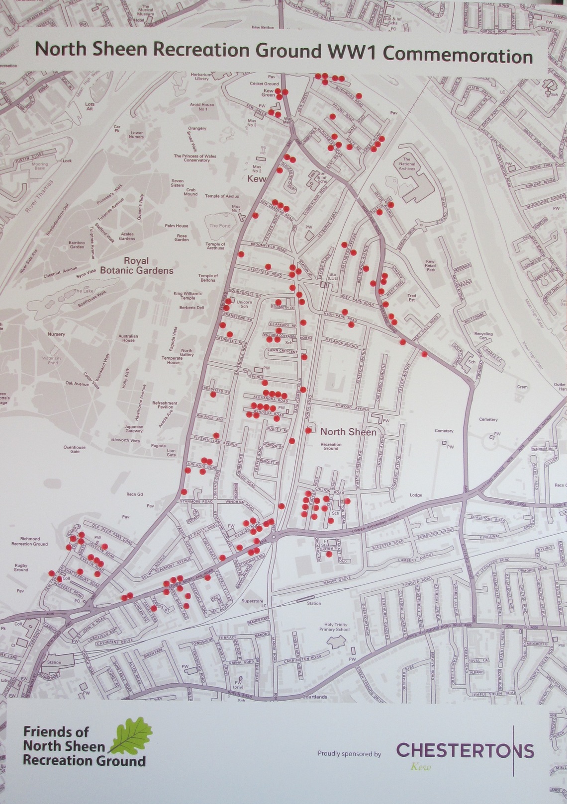 Our chair, Sue, spent many hours at the National Archives, researching the local heroes who fought in WW1 and gave their lives. The red dots show where they came from. We hope eventually to make this map interactive.