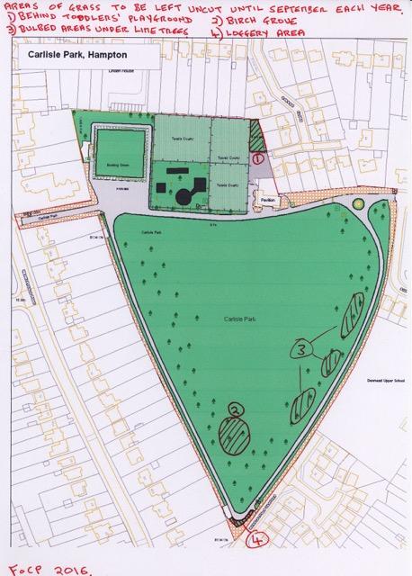 With the agreement of the Parks Department and the main contractor, Continental Landscapes several areas of longer grass have now been established. This map of the park shows the areas agreed to be left unmown until September each year.