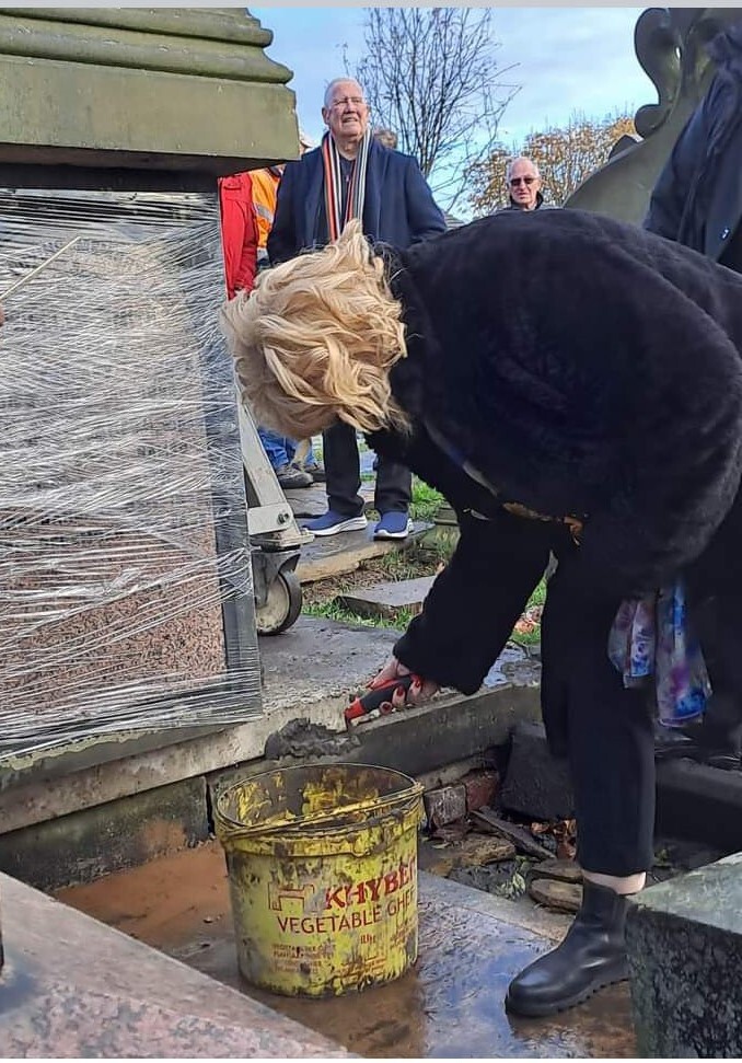The Lord Mayor of Bradford, Beverley Mullaney and her Consort placed cement for the first layers of rebuilding the monument. Other guests included Nigel Wood, Chairman of Bradford Bulls, Dr Manoj Joshi MBE DL, chairman of the Bradford Economic Partnership and his wife, our three local councillors Chris Hayden, Ian Parsons and Brendan Stubbs, and our advisor and friend Lincoln Oakley.