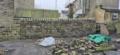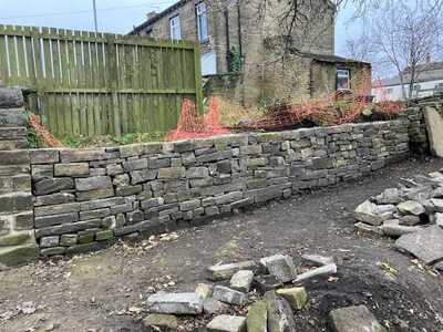 In the summer of 2024, we met up with Pauline, a fellow volunteer with local group Hirst Wood Regeneration Group. She knew of a retired dry-stone waller, and gave us the contact details for John. We were delighted when he agreed to come and build a section of dry-stone wall for us over 6 sessions for no charge. But the area along the top perimeter wall first needed to be cleared of fallen stones, vegetation and soil to expose the existing foundations. At around the same time, we welcomed new volunteer Chris who was willing to make repairs to the existing masonry wall which would adjoin the new dry-stone wall.