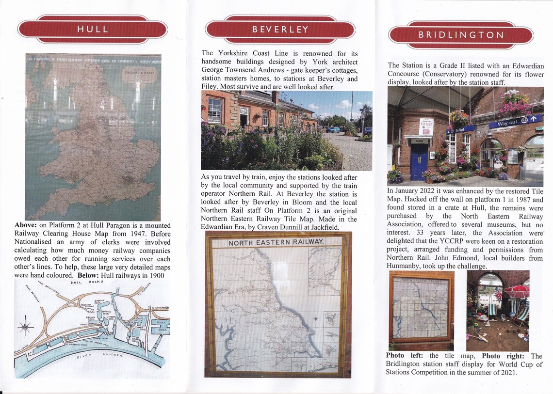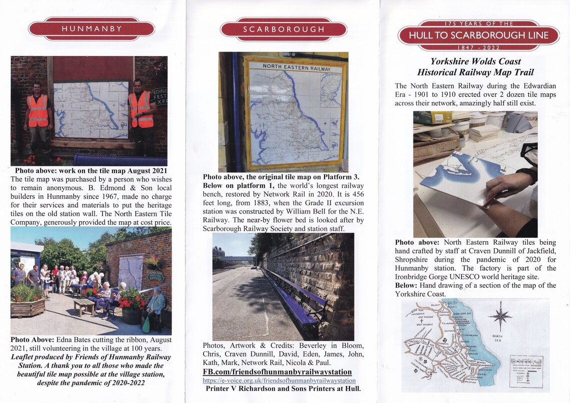 In the Edwardian era, over 110 years ago, the North Eastern Railway erected at least two dozen tile maps across its network. Amazingly half still exist, two being on the Scarborough to Hull railway line at Beverley and Scarborough. During the pandemic, two more North Eastern Railway Tile Maps were installed at stations on the line, Hunmanby and Bridlington. This full colour leaflet was produced in March 2022 as a thank you to all who made these beautiful maps possible.