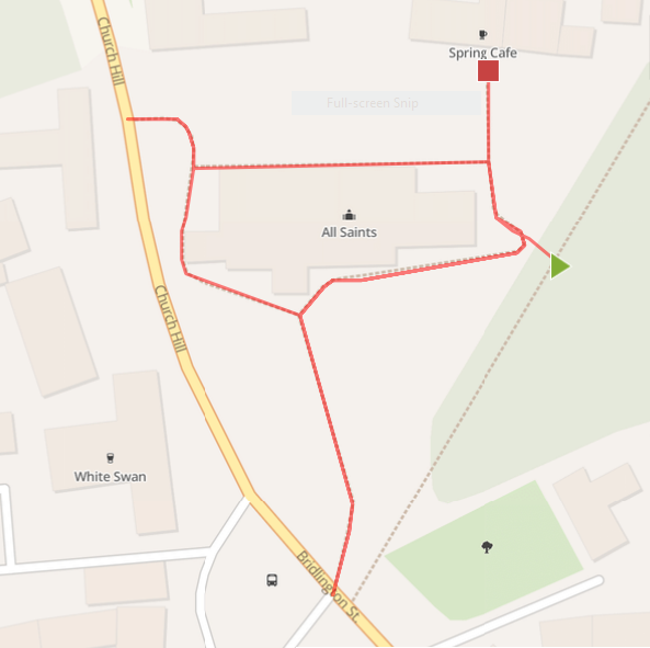 Map above: Village path 20, All Saints Churchyard circuit, from Church Walk, Church Hill and Bridlington Street