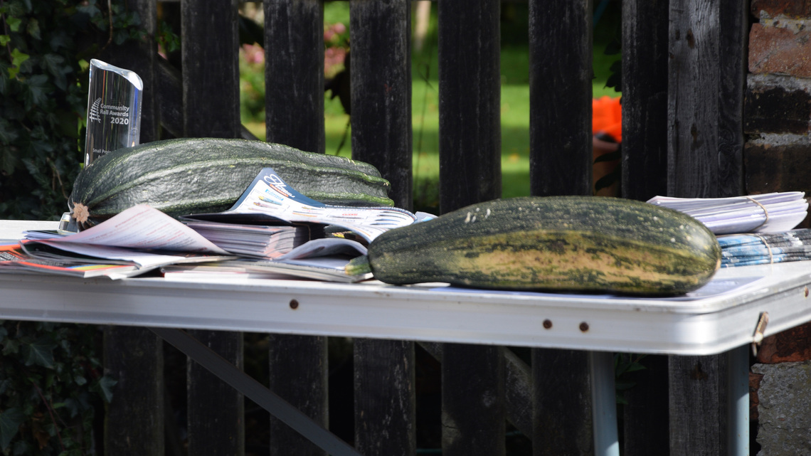 Photo above, 'Marrow' paperweights to hold down literature on the information table with the 1st prize trophy that Hunmanby village won in the National Community Rail Awards, during the pandemic in December 2020. Photo thanks to Paul.