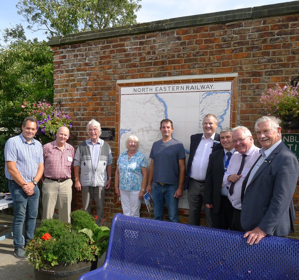 Heritage Day offered a chance for people involved with the tile map project to get together, from left to right, John Edmond, local builder who installed the tile map (B Edmond & Son); Eden Blyth from the North Eastern Tile Company; John & Monica Bridge owner of the station house wall; Chris Edmond, local builder who installed the tile map (B Edmond & Son); Pete Myers, Stakeholder Manager, Northern Rail; Richard Isaac, Regional Community & Sustainability Manager, Northern Rail; Graham North, Strategic & Performance Officer (BES) – Rail Strategic Support Service, North Yorkshire County Council; and Frank Paterson who serves on the Advisory Panel of the Railway Heritage Trust,