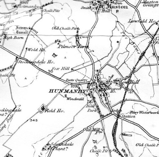 An early map of Hunmanby. It has been suggested that the railway line is distant from the village due to the Lord of the Manor wanting to keep the railway line away from his property. The old road from Hunmanby onto the Wolds along Garton Lane had been closed with the building of New Hill. This is clearly show, 1st turning on the left from the station going towards the village along Bridlington Street. The large rectangular piece of land started development as a Motte & Bailey built by the Normans, and subsequently Hunmanby Hall was developed on the site with the adjoining park land.