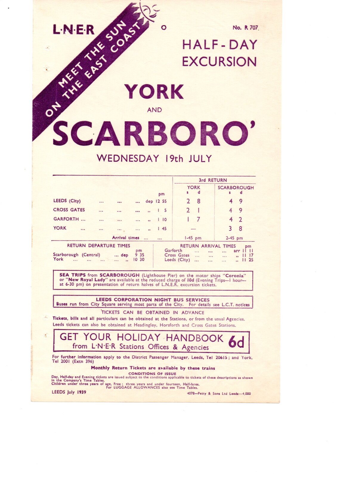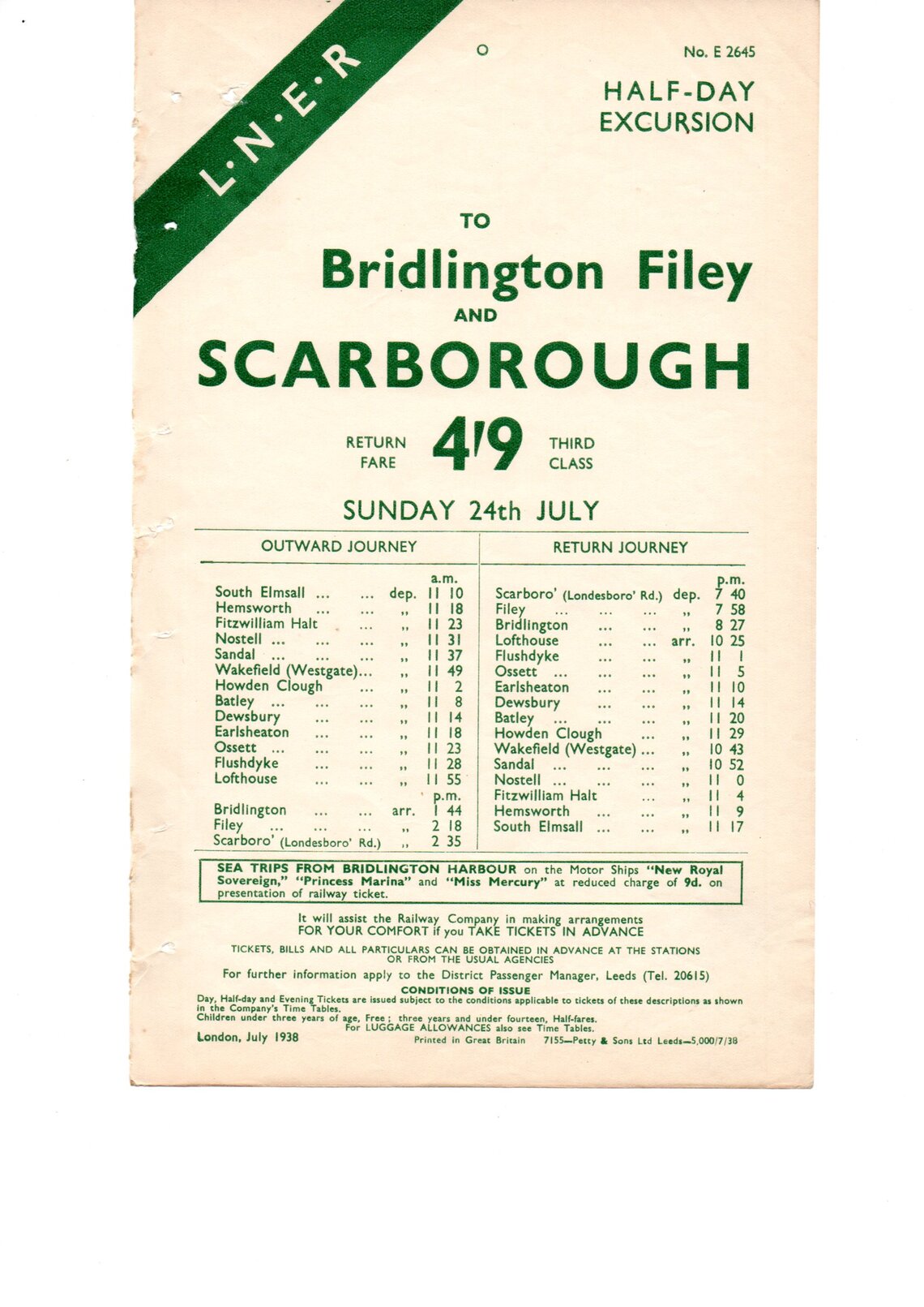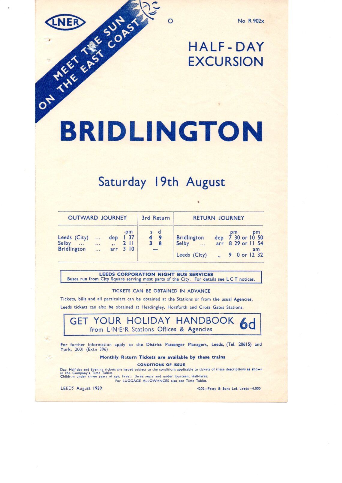 The Yorkshire Coast Railway line became a popular destination for excursion trains. The Victorians developed the seaside resorts of Bridlington, Filey, and Scarborough. Below are some old railway handbills of some of these trains, from 1939, a few months before the start of World War II. The London & North Eastern Railway Company own the railway line at this time. Thank you to Carl Pollitt & Margaret Hey (Bolton) for donating them. Several are now displayed in the Old Station Waiting Rooms at Hunmanby Railway Station.