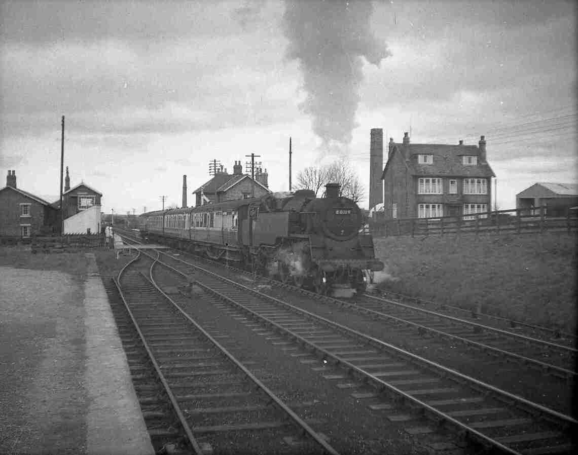 Photo above Class 4MT Locomotive Number 80119, hauling a local train away from Hunmanby to Hull in the 1950's. Note the brick works chimney, still standing along with the catch points and goods siding to the cattle dock siding. These 2-6-4T Locomotives were introduced by British railways in 1951, designed at Brighton. With the rapid run down of steam in the 1960's locomotive 80119 was withdrawn from service after just 14 year's service. The photograph was taken by the late Tony Ross, Further details from the webpage a tribute to Tony Ross.