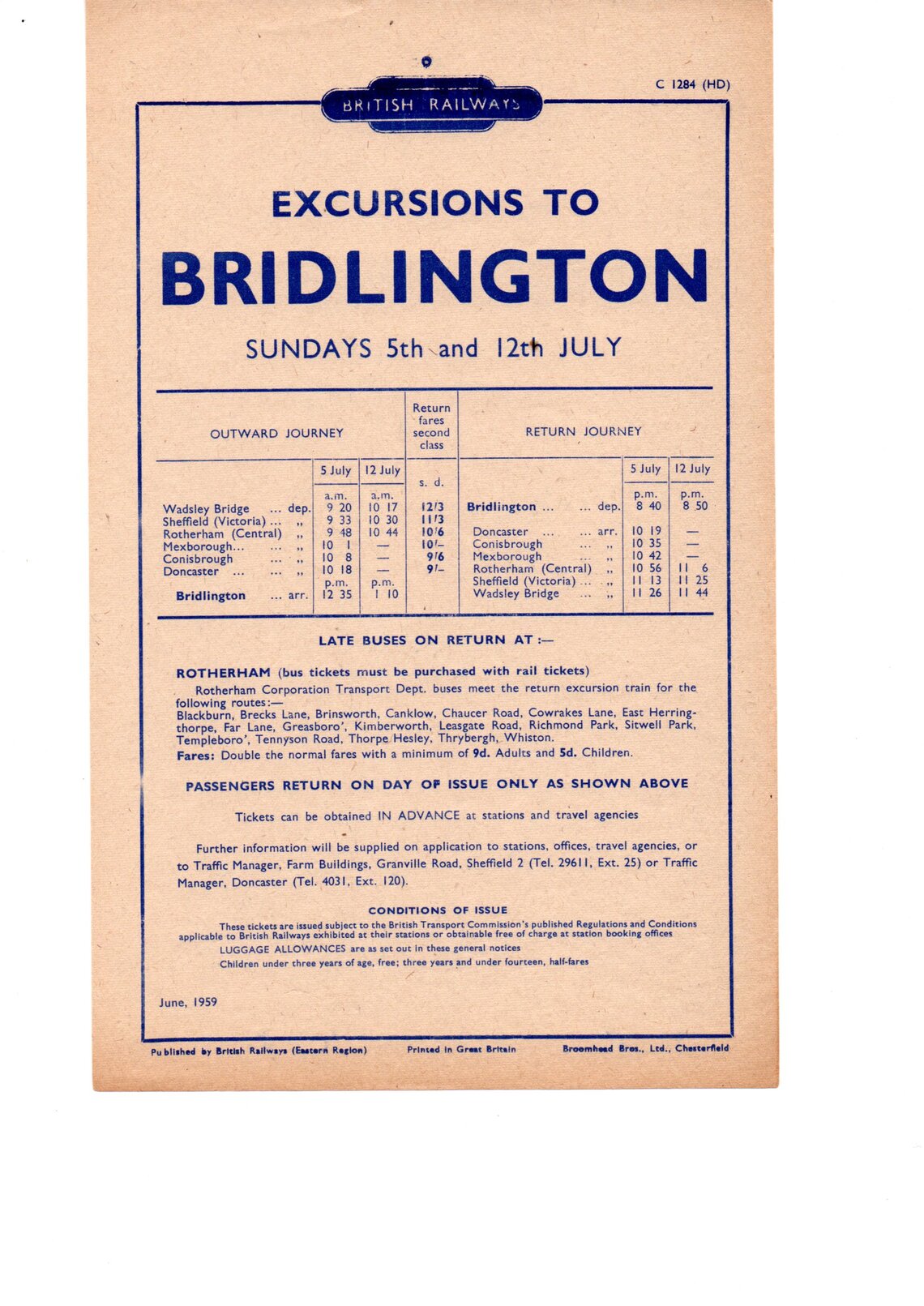 This old railway hand bill below, was again kindly donated it shows an excursion train running on 2 consecutive Sundays by British Railways from Wadsley Bridge (near Sheffield) in July 1959. Thank you to Carl Pollitt & Margaret Hey (Bolton) for donating them. One of several that are now displayed in the Old Station Waiting Rooms at Hunmanby Railway Station.