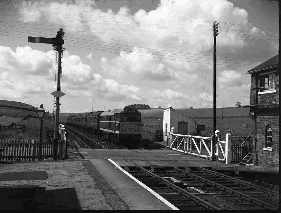 Photo above, Type 2, Class 31 diesel locomotive hauls an 8 coach train north through Hunmanby, the likely destination is Filey Holiday Camp. Introduced from 1957, and given the 'D' prefix' for Diesel, 'E' was for Electric. The livery is two tone green, which suited these Brush built locomotives. In 1964 the line is still double track all the way to Hull. The photograph was taken by the late Tony Ross, Further details from the webpage a tribute to Tony Ross Thank you to the North Eastern Railway Association for kindly allowing the photo to be used on this page.