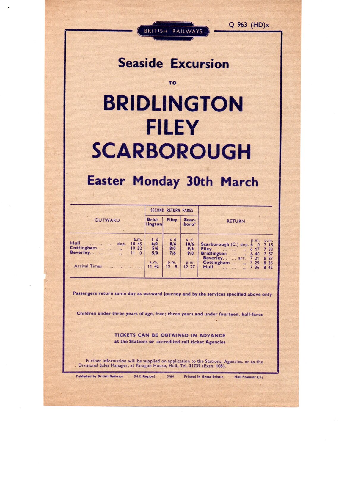 The Excursion trains and extra services being provided at times of high demand continued, as the railways were still popular taking people from the northern industrial towns to the Yorkshire Coast. (With the offer of cheaper fares by travelling at off peak times to spread demand. The poster, below, for Easter Monday 1964 between Hull, Bridlington, Filey, and Scarborough. Thank you to Carl Pollitt & Margaret Hey (Bolton) for donating them. One of several that are now displayed in the Old Station Waiting Rooms at Hunmanby Railway Station. A key date for Hunmanby Railway Station is 1964, on 10th August, the Goods Yard closed.