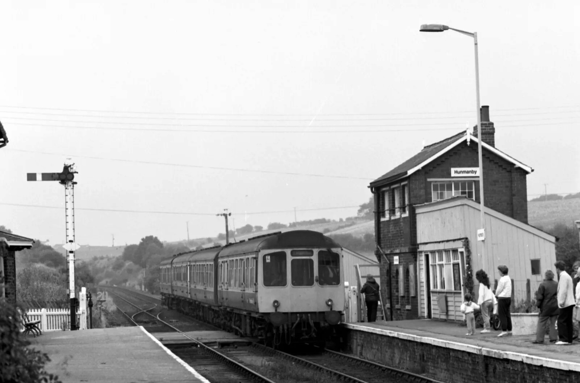Above: Many thanks to Steve, who purchased this negative of Hunmanby Station on 29th August 1989, showing a 1st generation diesel multiple unit train comprising of 4 coaches arriving with the 17:15 service from Hull to Scarborough