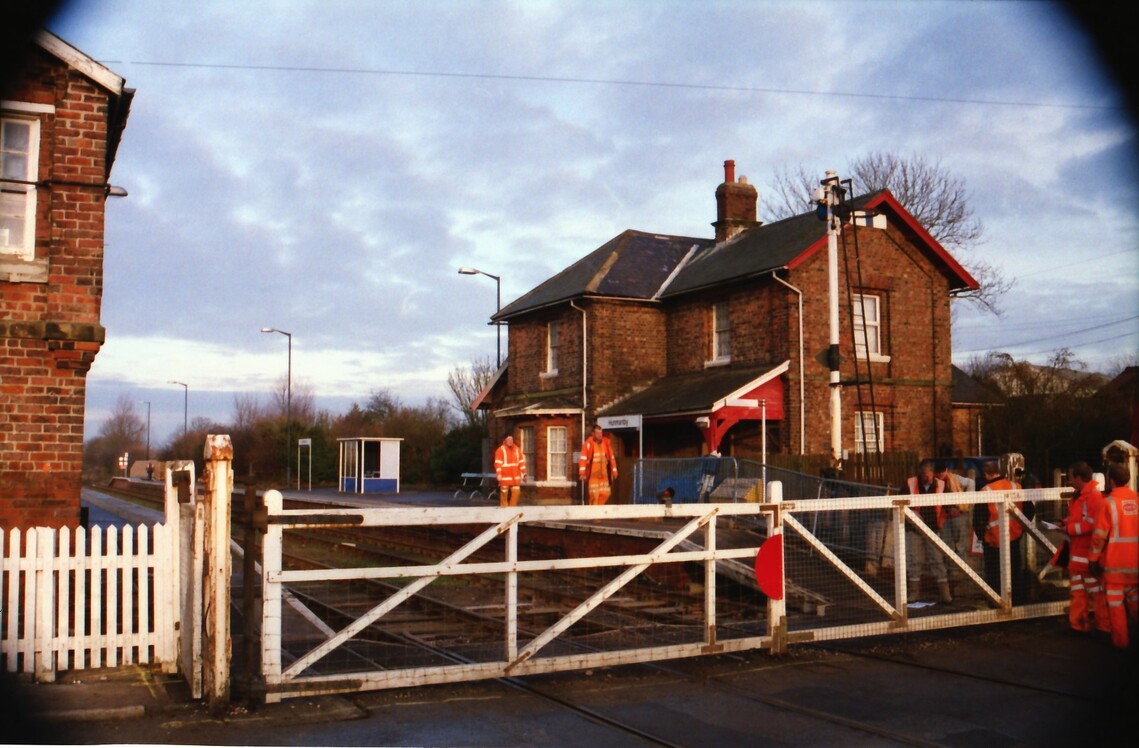 Working starting on taking down the old railway station signal box on the 11th of January 2001. Arriving just in time with the Crossing Gates intact. Note the old wooden waiting rooms on the Scarborough platform. (Photo thanks to David Milburn)