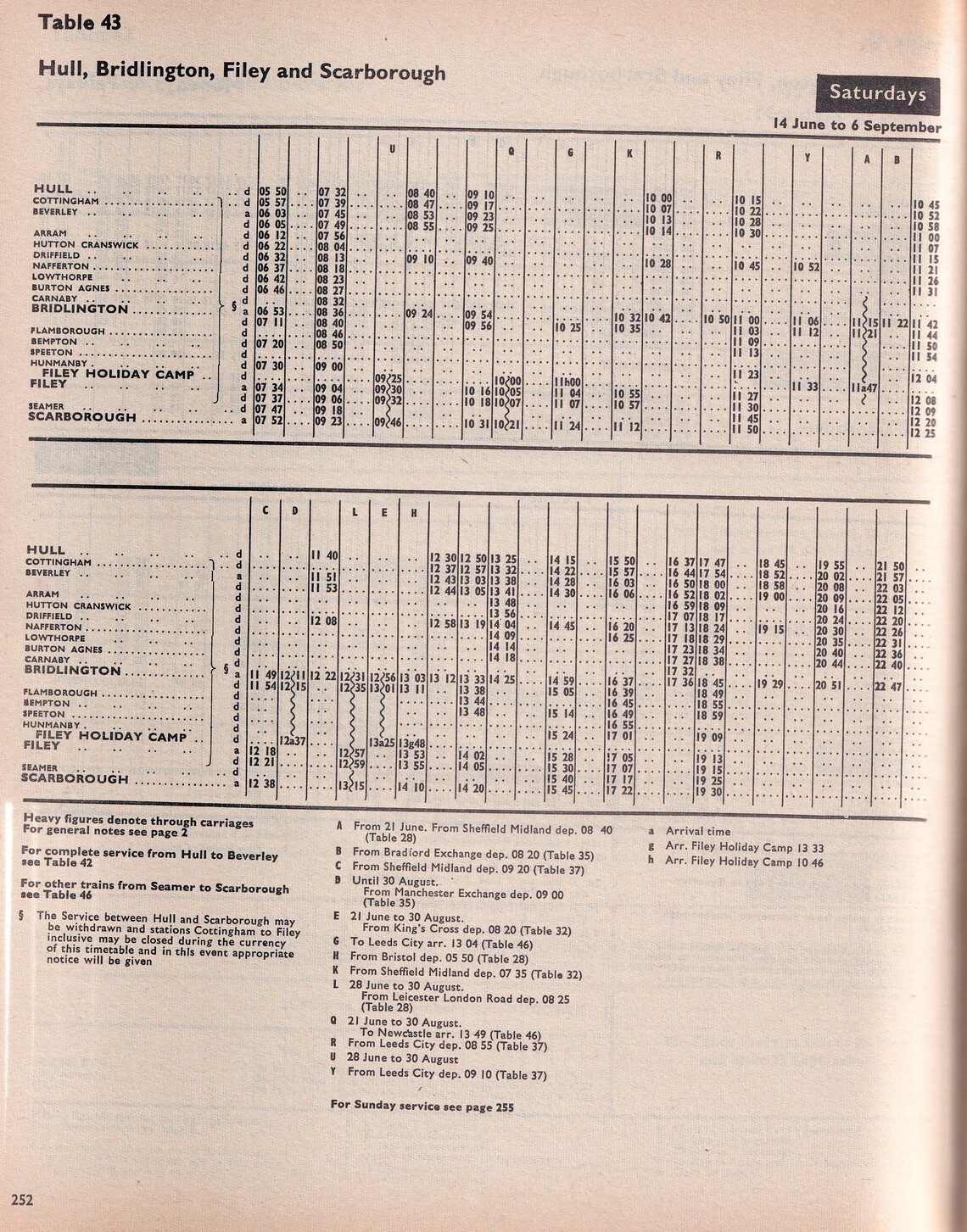 Full details at the timetable world website (The Hull to Scarborough service is Table 108) Just 3 years after the end of World war II, In 1948, the 4 private railway companies were Nationalised.