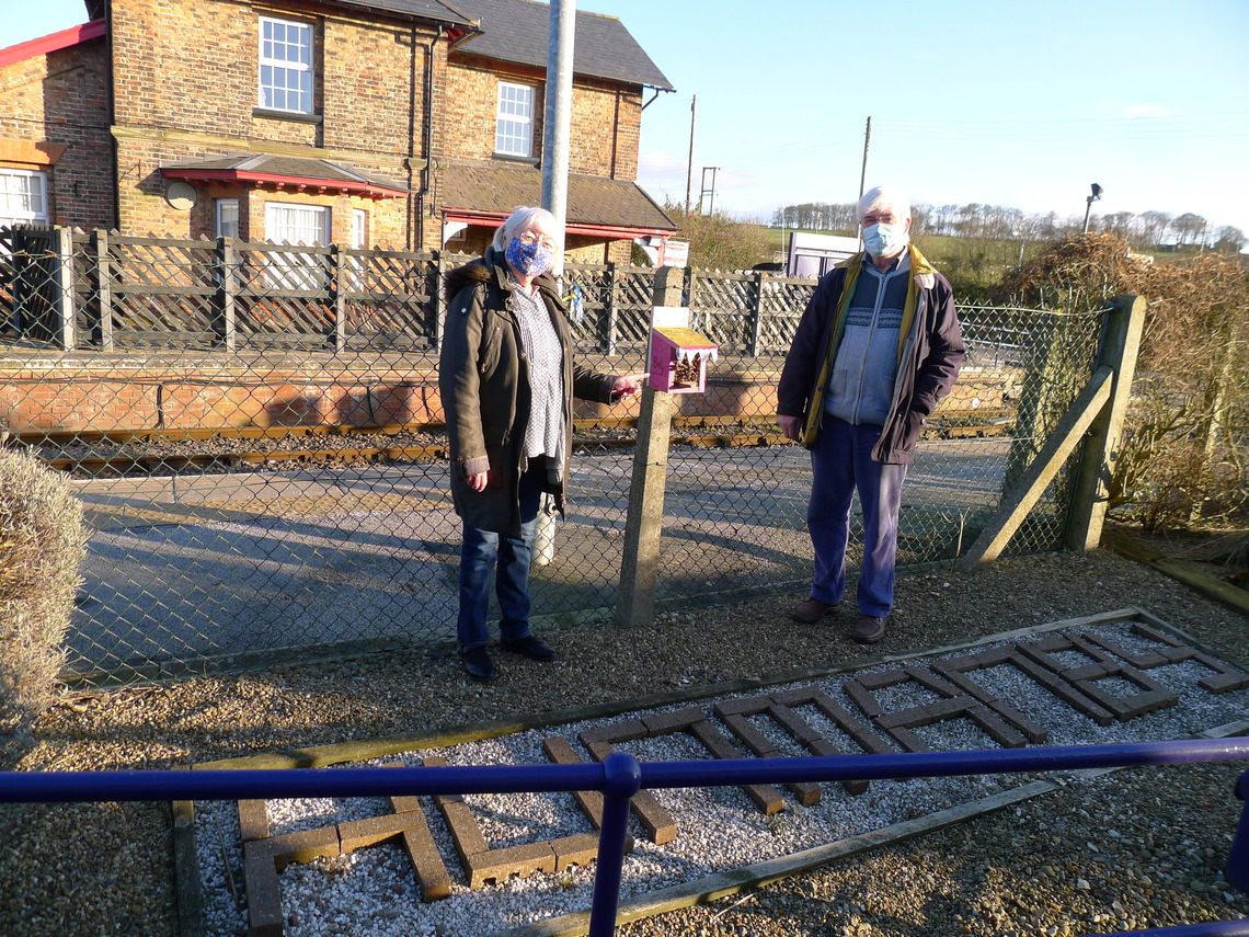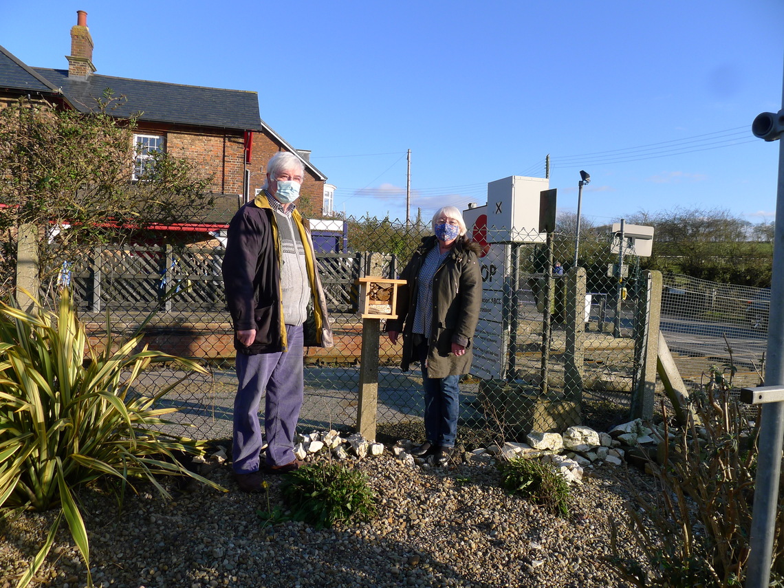 Photo above: John & Monica with the bug hotels. The Hunmanby sign was constructed by the Community Payback team who worked hard creating both the brick sign and large planter made of old railway sleepers, over a decade ago, and built to last. In the background is the North Eastern Railway Station House.